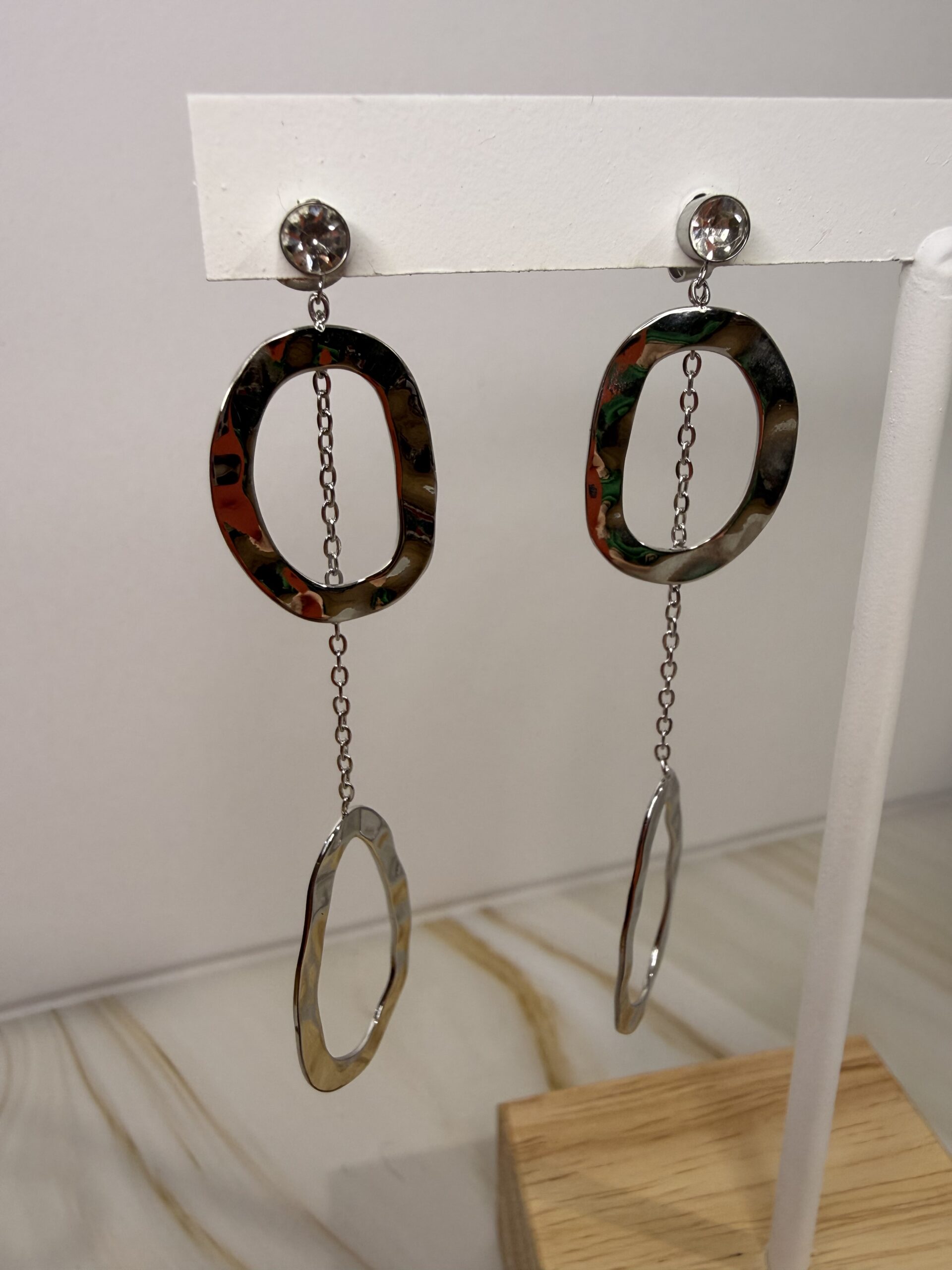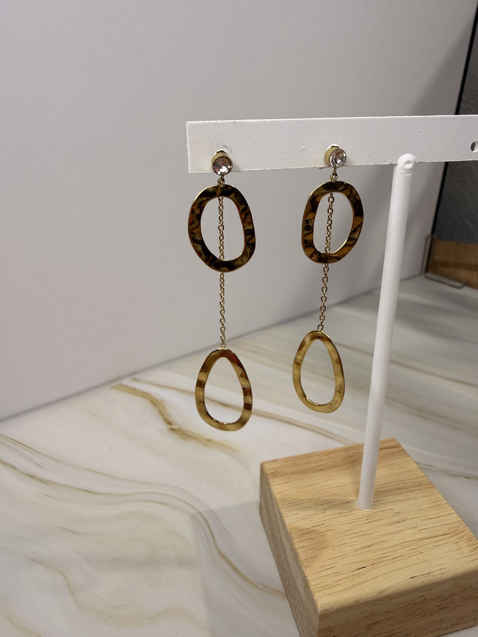 Boucles d’oreilles à puce composées d’un strass et de deux anneaux martelés dont l’un au bout d’une chaîne tombante.